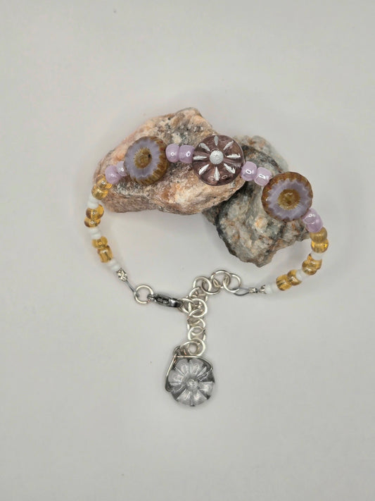 Czech Purple flower glass beads wire bracelet with Czech flower glass charm