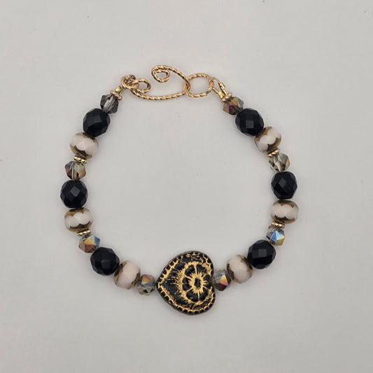 Antique brown leather bracelet with porcelain and Czech glass beads