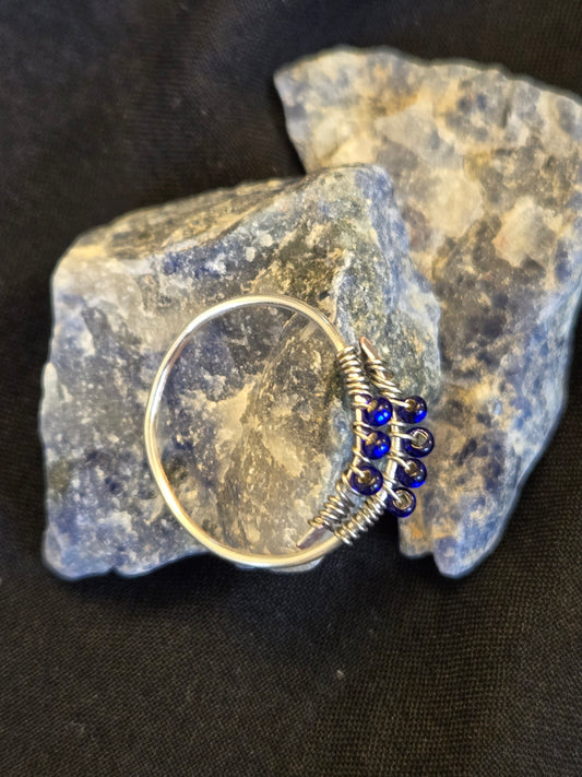 Adjustable Silver Bypass ring with Deep Blue glass seed beads