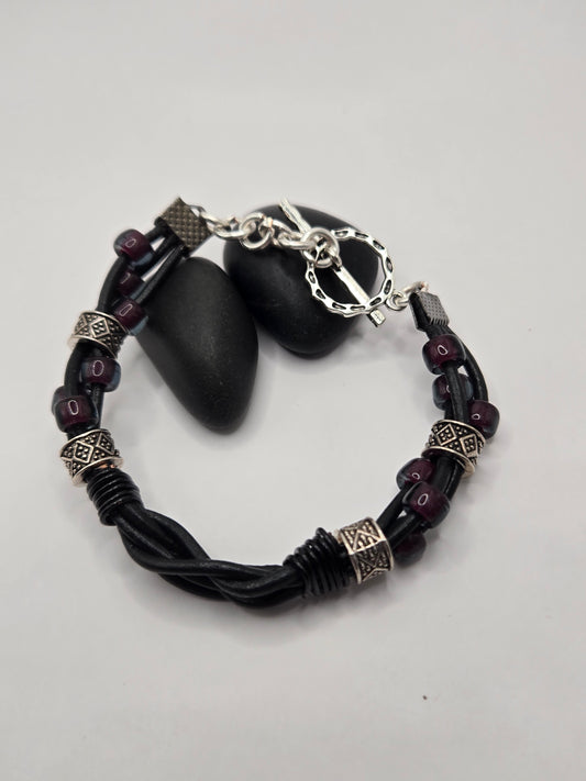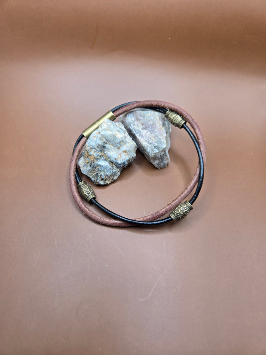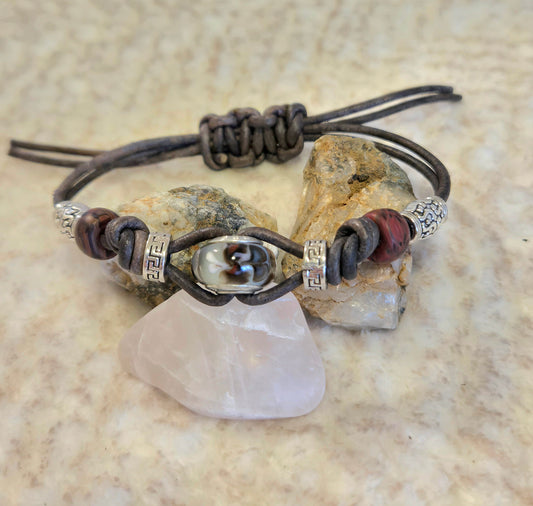 Antique brown leather bracelet with porcelain and Czech glass beads
